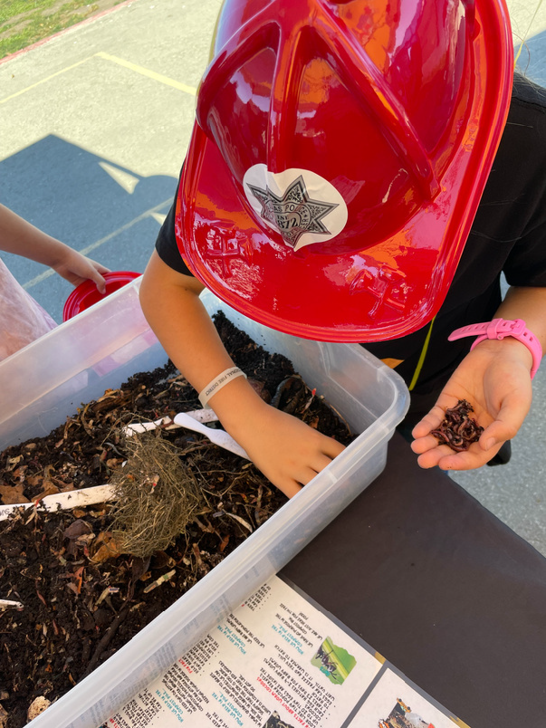 Patrick holding a giant Red-Wiggler worm model. On loan from ReGen Monterey.