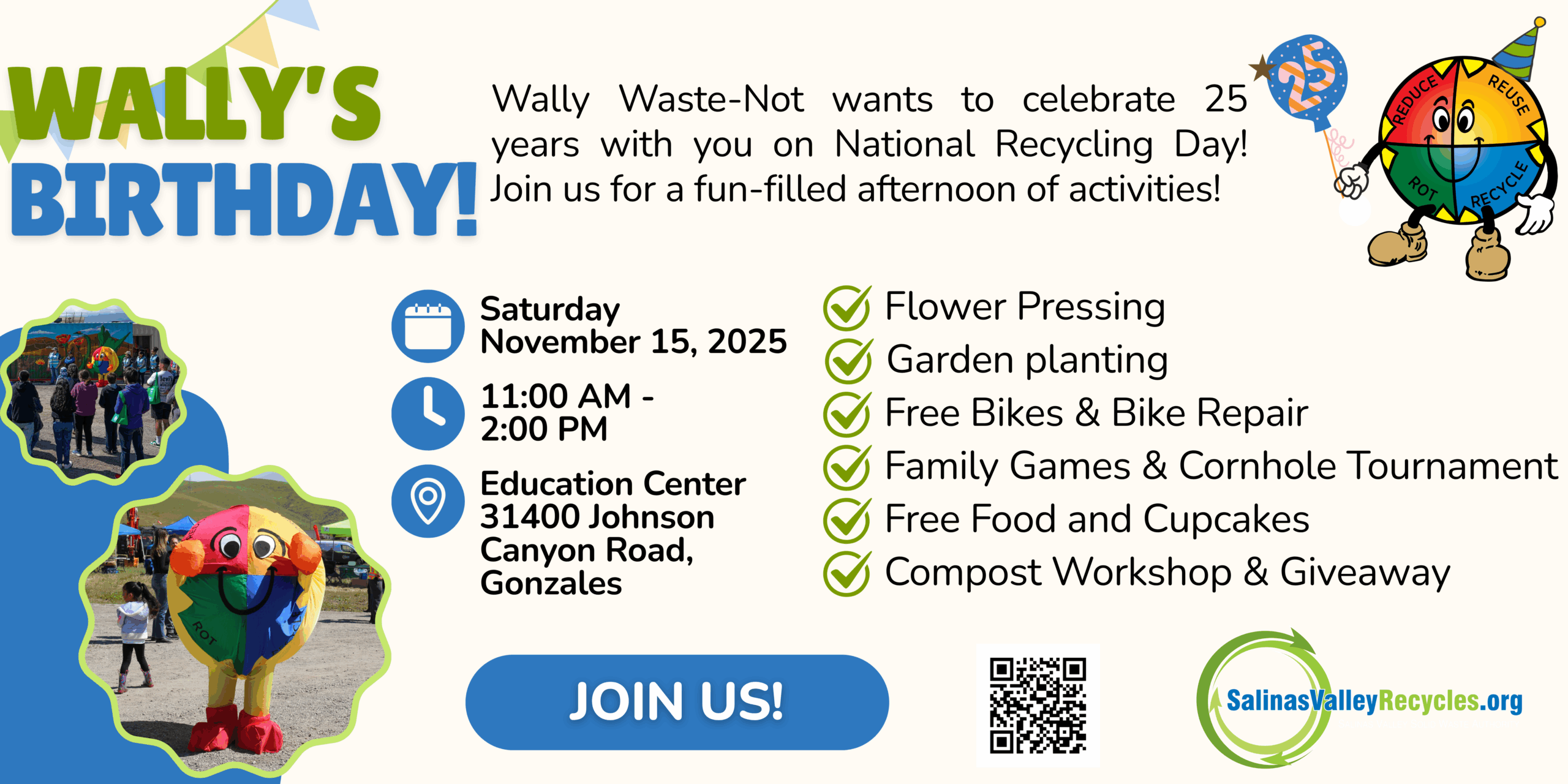 Most importantly.....food! It's not a proper birthday party without food and dessert, and Wally Waste-Not wants to celebrate the right way. We'll have burritos for our guests available before we all sing Happy Birthday to our beloved mascot and hand out cupcakes! Our zero-waste station will be available to toss your leftovers and recyclables.
